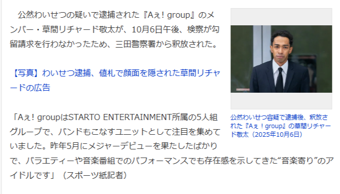最近のニュースで最も衝撃的だったのが、『Aぇ! group』のメンバー・草間リチャード敬太さんに関する報道です。